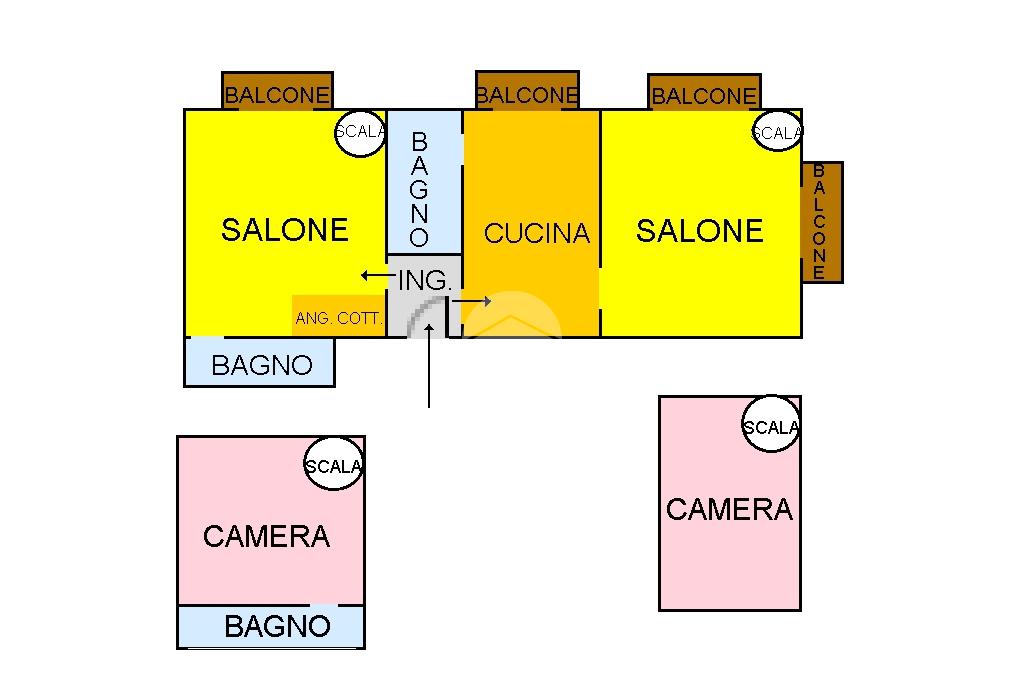 L'appartamento attualmente è cosi composto: due camere da letto in soppalco, tre bagni totali, di cui uno è situato in una delle camere da letto, due cucine e quattro balconi con affacci diretti su Via Atri e Largo Arianiello.