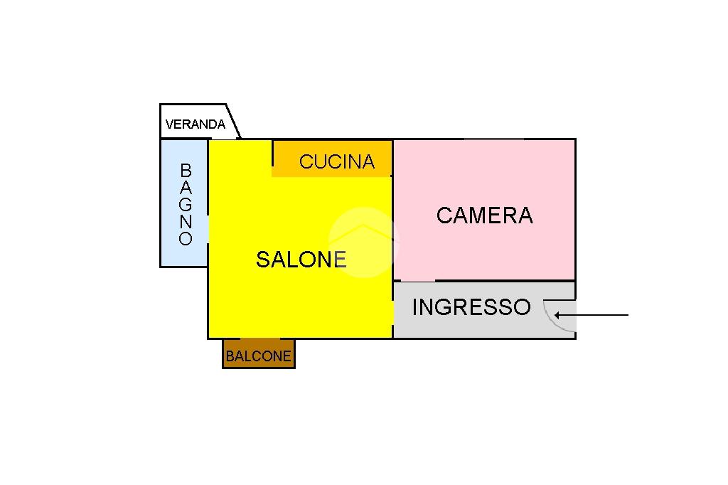 L' immobile è cosi composto: ingresso, camera, salone cucina con balcone con affaccio interno al cortile del fabbricato, bagno e veranda.